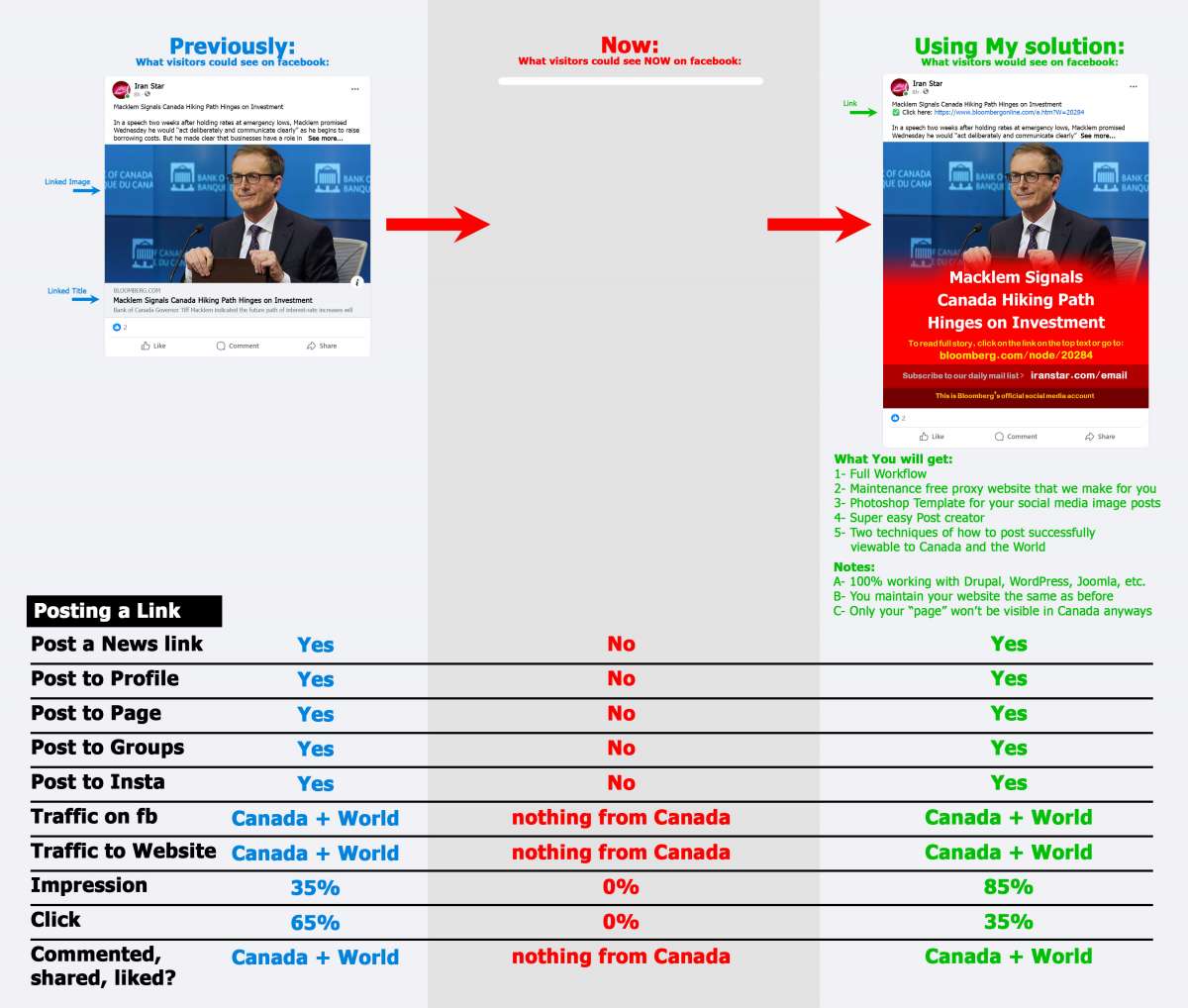 Currently, apart from that you can not post a News Link, anyone who is physically in Canada can NOT see any News post, but the rest of the World can. Our solution changes this so that people from everywhere "including Canada" can see your post and click to go to your website except on your Facebook page.
